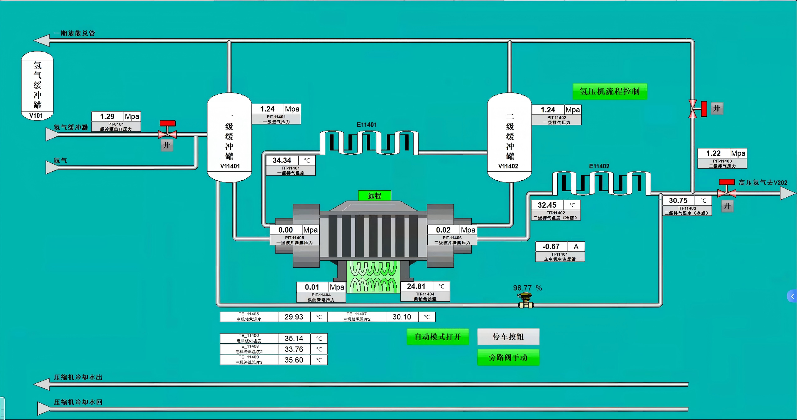 纯水处理阶段, PLC通过电导率传感器和PID算法实时调节电解液浓度,波动控制在 ±0.5%内, 电解反应和能量转换中,在绿电波动时, PLC启动预加热模式:利用缓冲罐储存的氢气循环加热电解液,缩短启动时间40%,通过压差传感器监控分离效率,确保气相含水量<5%,动态调节干燥塔切换周期,根据湿度传感器数据预测分子筛饱和度。全程使用自控控制模式,通过PID调节保证氢气的高效高质产出。